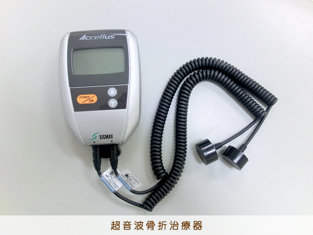 微弱な超音波を1日1回約20分間、骨折部に当てることで骨折治癒を促進します。